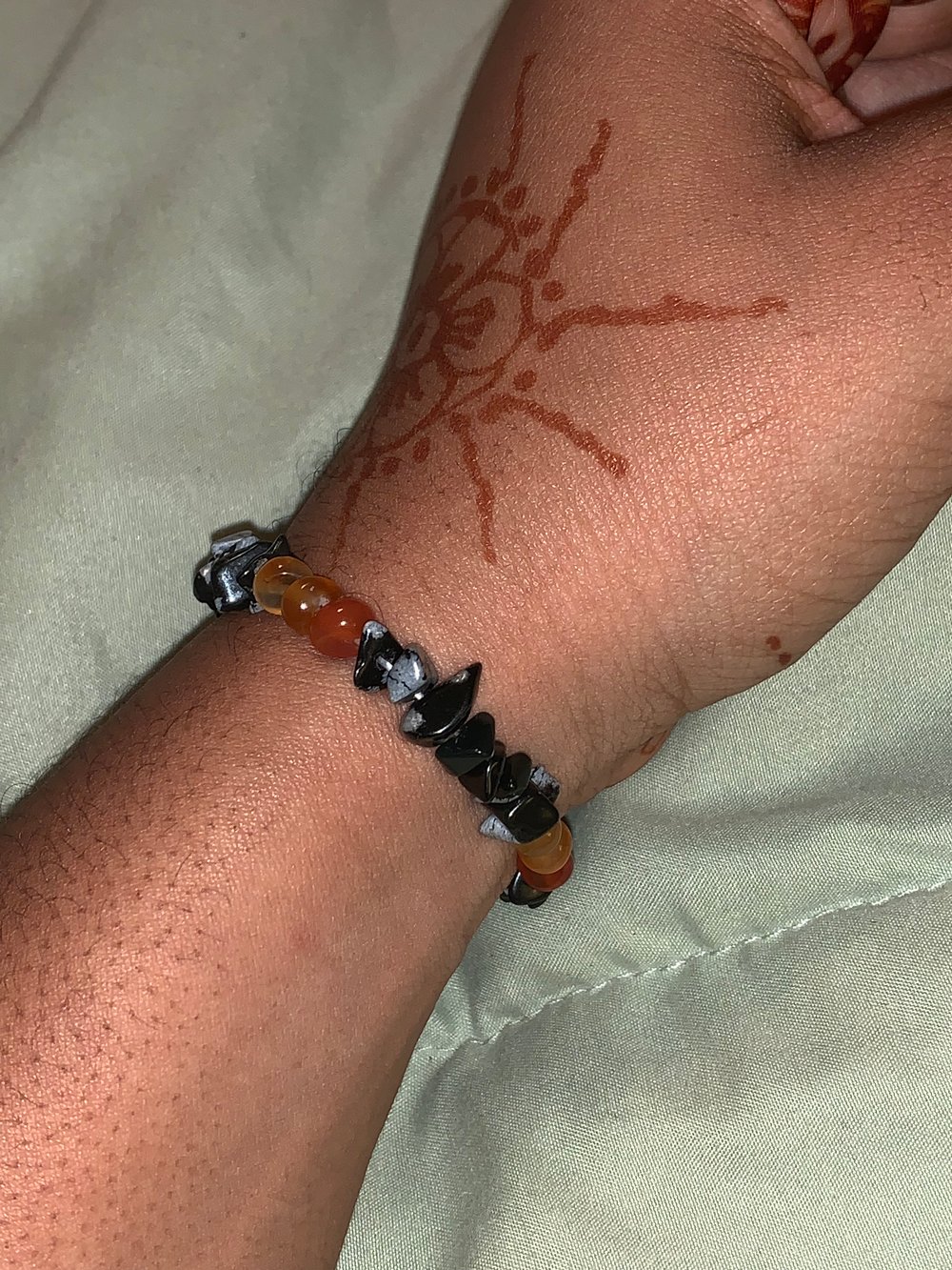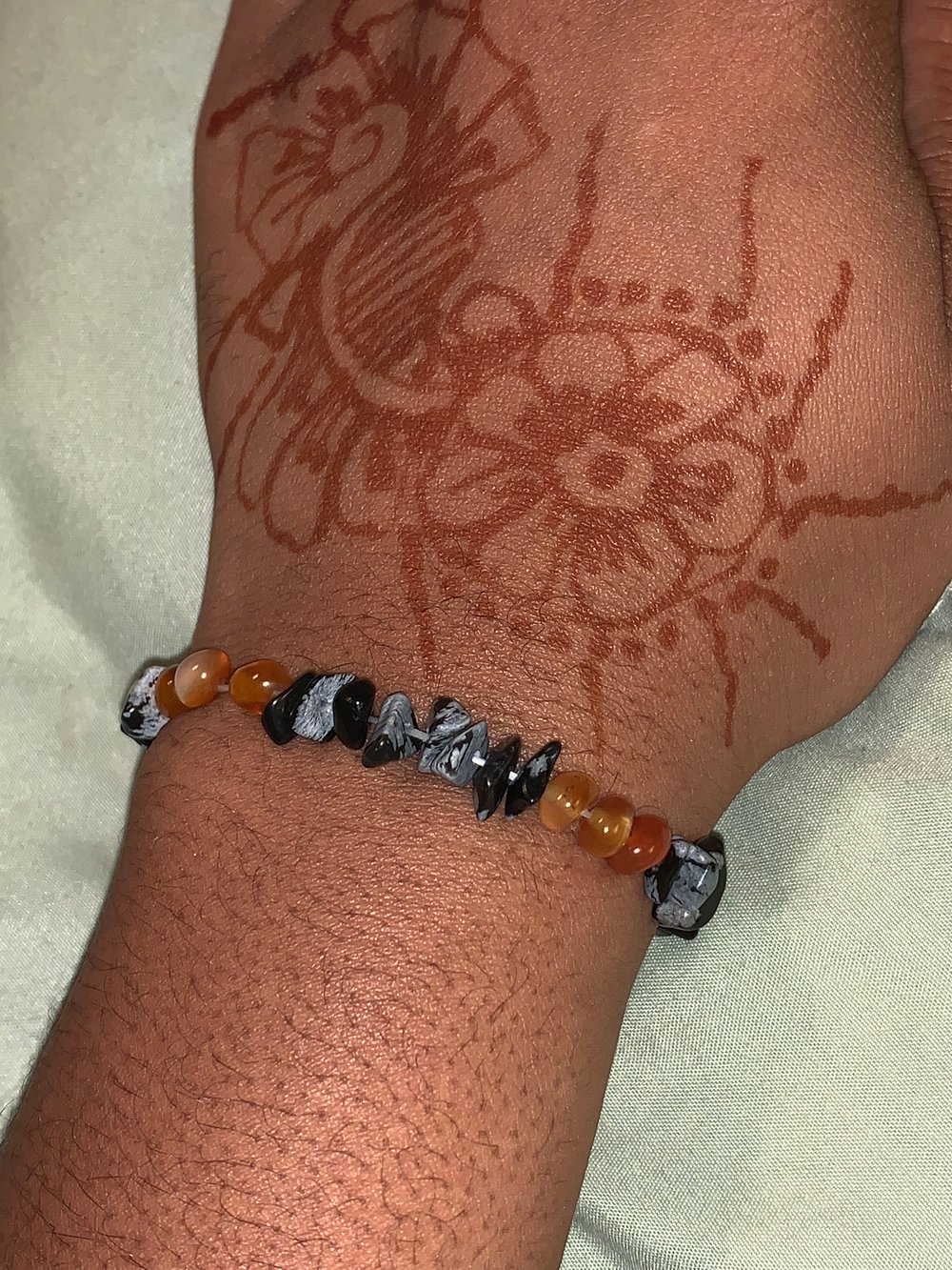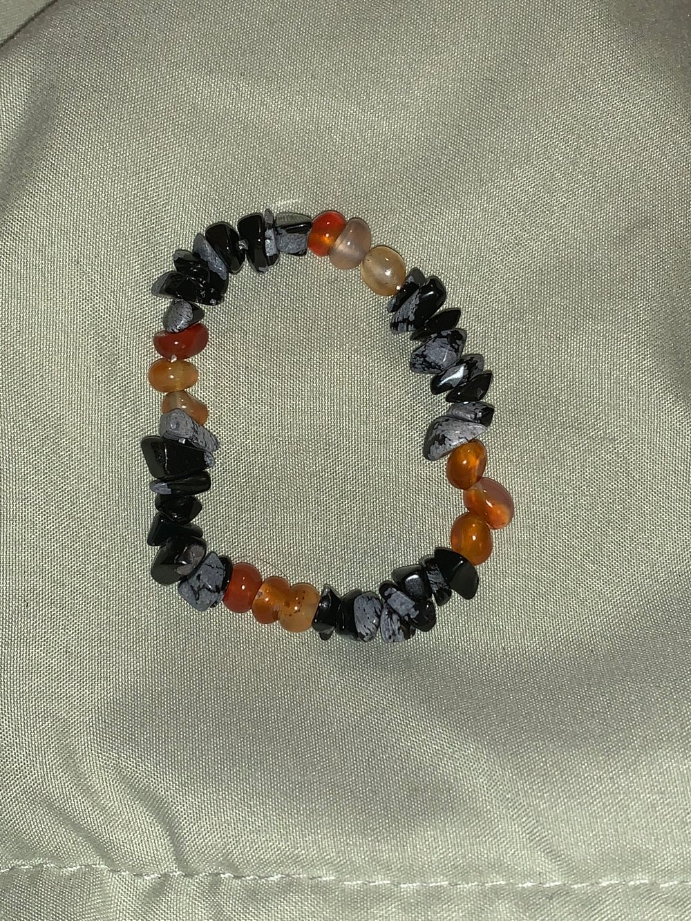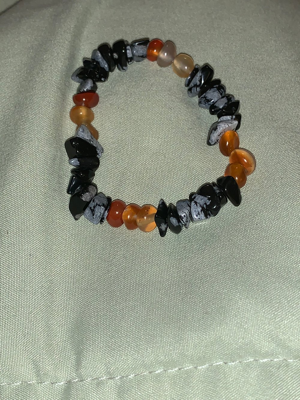 Powerful Snowflake Obsidian is a grounding stone associated with purity and helps with balancing the mind, body, and spirit. Snowflake Obsidian helps one to view unhealthy patterns in their behavior, thus, causing them to be more intune with themself. Carnelian is a high energy stone that can help stabilize areas in your life. Carnelian calms turbulent emotions, it’s a great antidepressant, it increase vitality, and also helps to generate wealth.